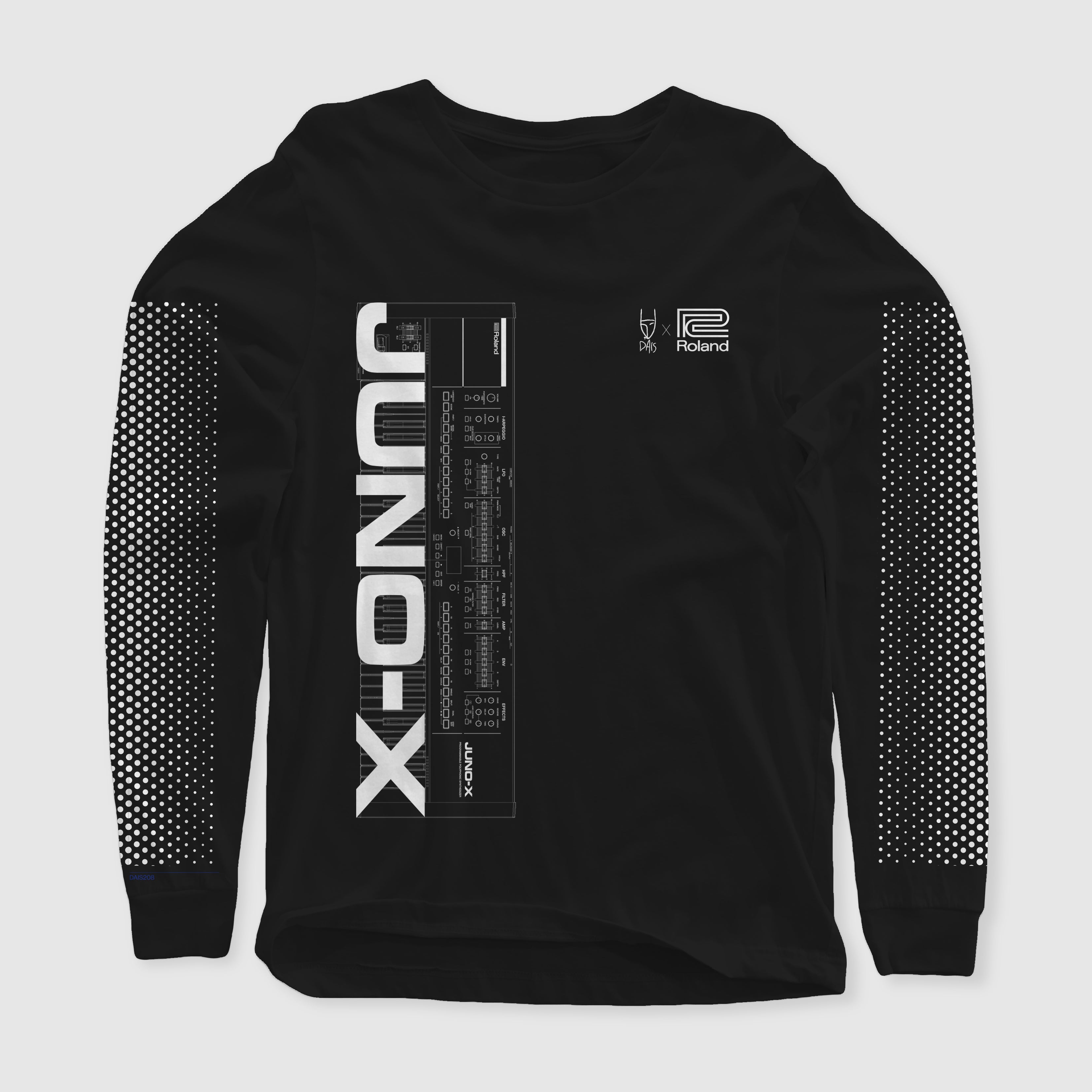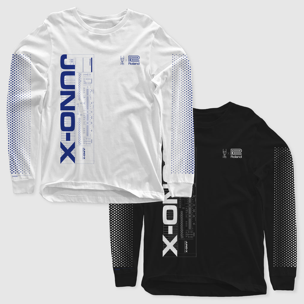 Dais x Roland limited "JUNO-X" long sleeve t-shirt features the wireframe design of the synth itself, alongside the JUNO-X logo, and breast branding of Dais x Roland. Additional sleeve design includes halftone pattern design element. Comes across two colorways on black and white long sleeve t-shirts. Designed by Nathaniel Young.
